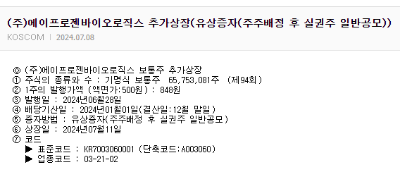 이 회사는 전날 한국거래소 카인드(KIND)를 통해 지난 6월 28일 발행한 신주 6575만3081주를 오는 11일 추가 상장한다고 공시했다. 신주 발행가액은 848원으로, 상장 신주는 약 558억원어치다. 해당 공시 게재 시점은 8일 장 종료 후인 오후 5시23분이다. 이후 시간외 매매에서 에이프로젠바이오로직스 주식 11만9596주가 종가 대비 3.02% 떨어진 1508원에 거래됐다.