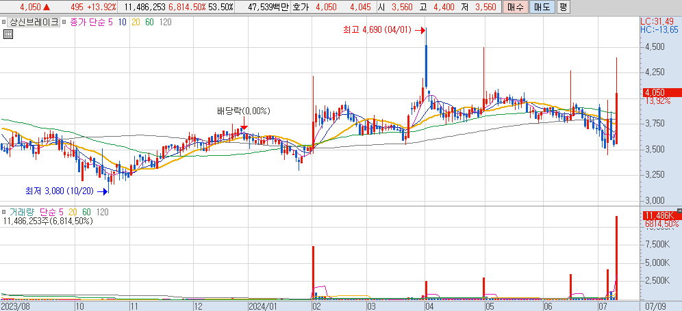 상신브레이크는 앞서 미국 도로교통안전국이 자동비상브레이크 설치를 의무화하는 규정을 발표했을 때 주가가 오르는 등 관련주로 분류된 바 있다.