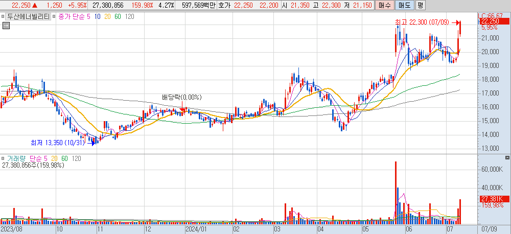 9일 한국거래소에 따르면 두산에너빌리티는 오전 9시50분 현재 유가증권시장에서 전 거래일 대비 3.10%(650원) 오른 2만1650원에 거래되고 있다. 장초반 6.19%(1300원) 오른 2만2300원에 거래되며 신고가를 기록했다.